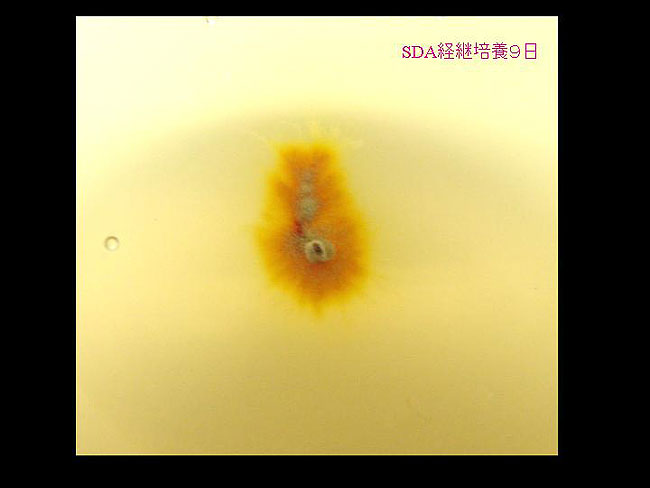 これで診断は確定です。真菌を培養してみると、黄色い色素を出す毛羽だった菌集落(写真)で、菌成分の顕微鏡所見(写真)から、「トリコフィートン・トンスランス」であることが同定できました。