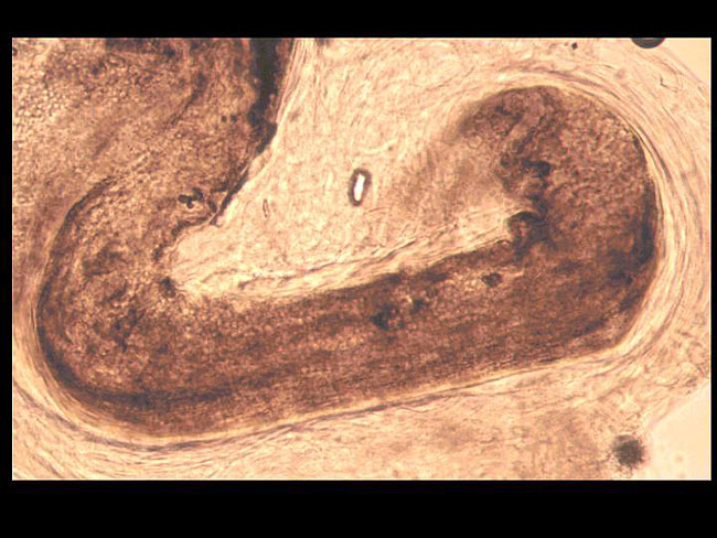 以前、このような症例を経験していたので、これは「blackdotringworm」(黒点状白癬)ではないかと考えました。さっそく診断のためにその黒点(真菌によって毛が切れたもの)をピンセットで引き抜いて、顕微鏡で見ると、やっぱり毛の中に丸い真菌の胞子が沢山見られました(写真)。