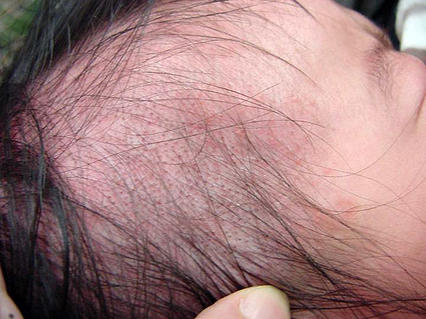 原因となるカビは、10年前には日本ではほとんど見られなかったのです。いきなりここ数年前より増えだしたのです。柔道やレスリングの選手が海外試合に出て感染したと言われています。最近、経験した患者さんは、10ヵ月の赤ちゃんの頭の脱毛が治療しているが治らないと来られました。頭の脱毛部を診ると、黒い点がポツポツと沢山診られました(写真)。