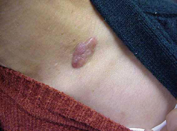 - 左鎖骨上部の皮膚に4cm大で表面凹凸があり、触診でやや硬い腫瘤をみとめる。自覚症状はない。同側腋かリンパ節は触知しない。